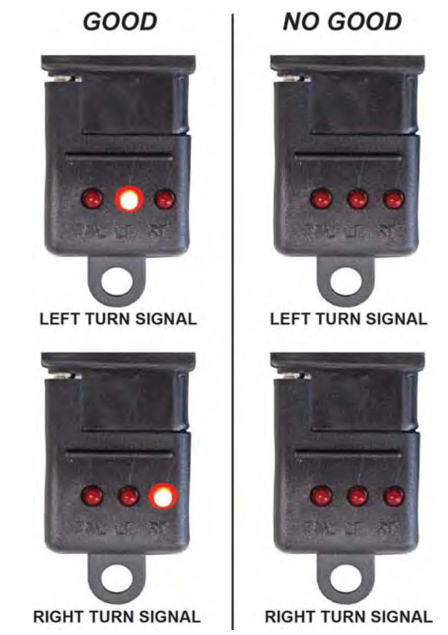 2. Remove the connector and turn it upside down. Insert the 4-pin circuit tester into the harness, then have an assistant test the turn signals and the brakes separately and together while you watch the tester.