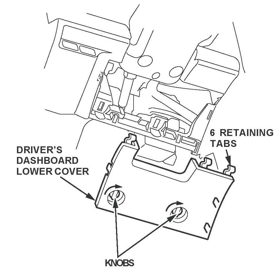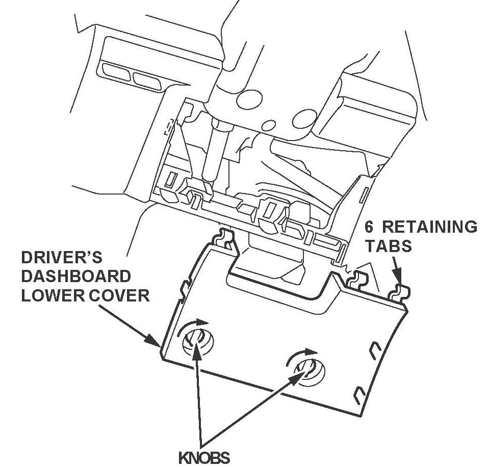 3. Remove the driver's dashboard lower cover by turning the knobs clockwise, then pull the lower cover out toward you to release the six retaining tabs.