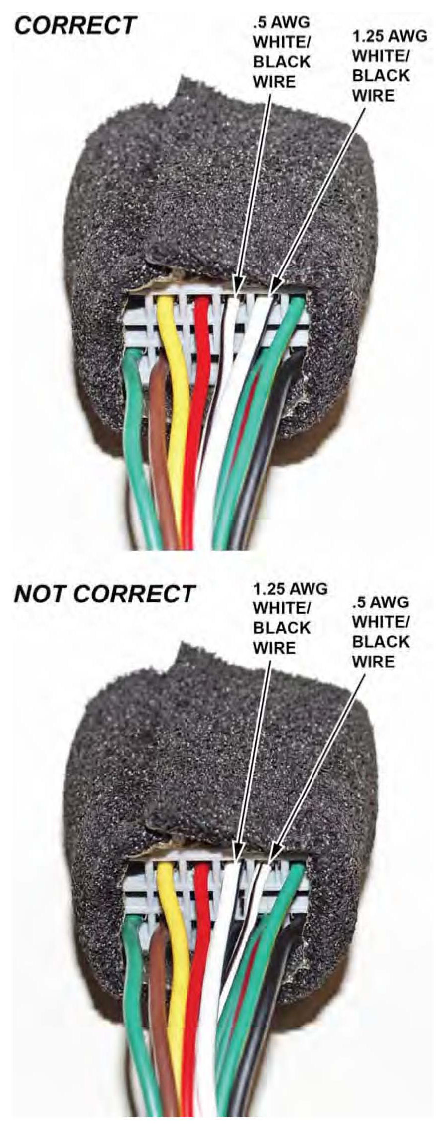 5. Visually inspect the white/black wire positions at pins 8 and 9 in the 12-pin connector.