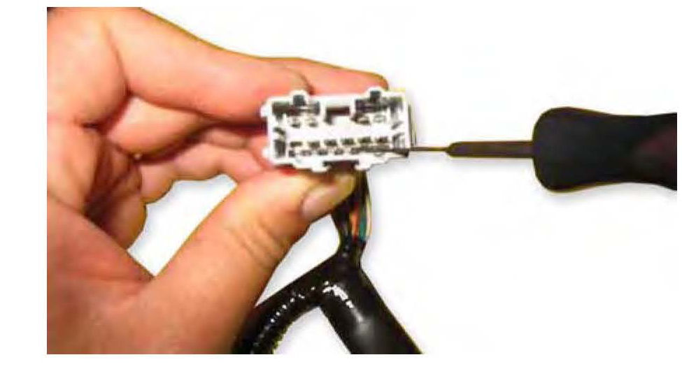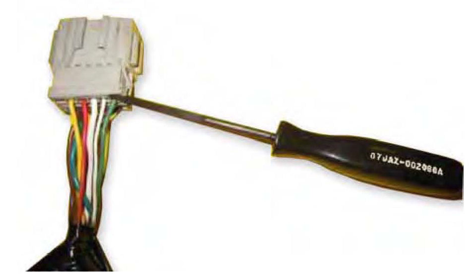 3. Using a terminal pin tool (T/N 07JAZ-002050A), remove the large White/Black wire and the small White/Black wire from the connector.