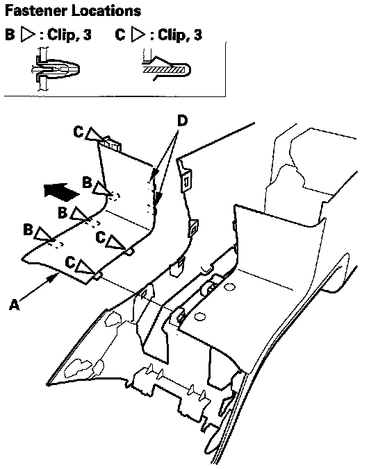 2. Gently pull out the driver's console trim (A) to detach the clips (B, C), then remove the trim by releasing the hooks (D).