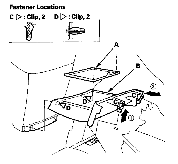 2. Pull the right side portion of the trim up to release the hooks (C) and clips (D).