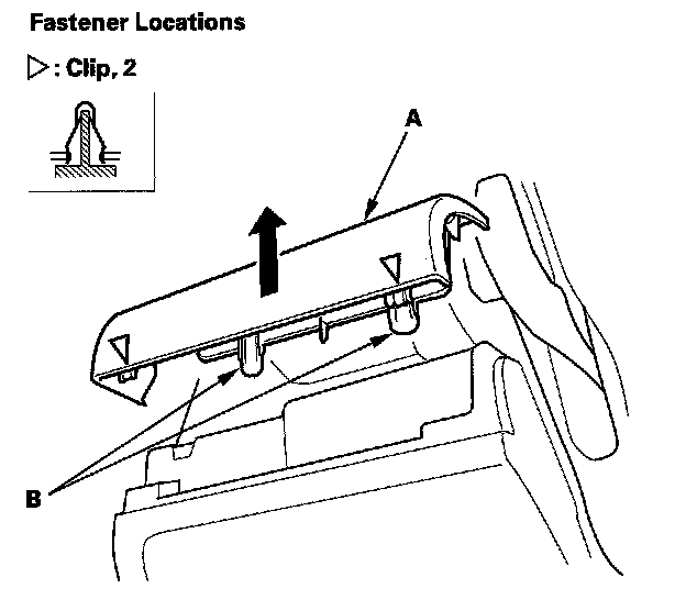 1. Pull out on the driver's outer dashboard trim (A) to release the clips and hooks (B) from the dashboard.
