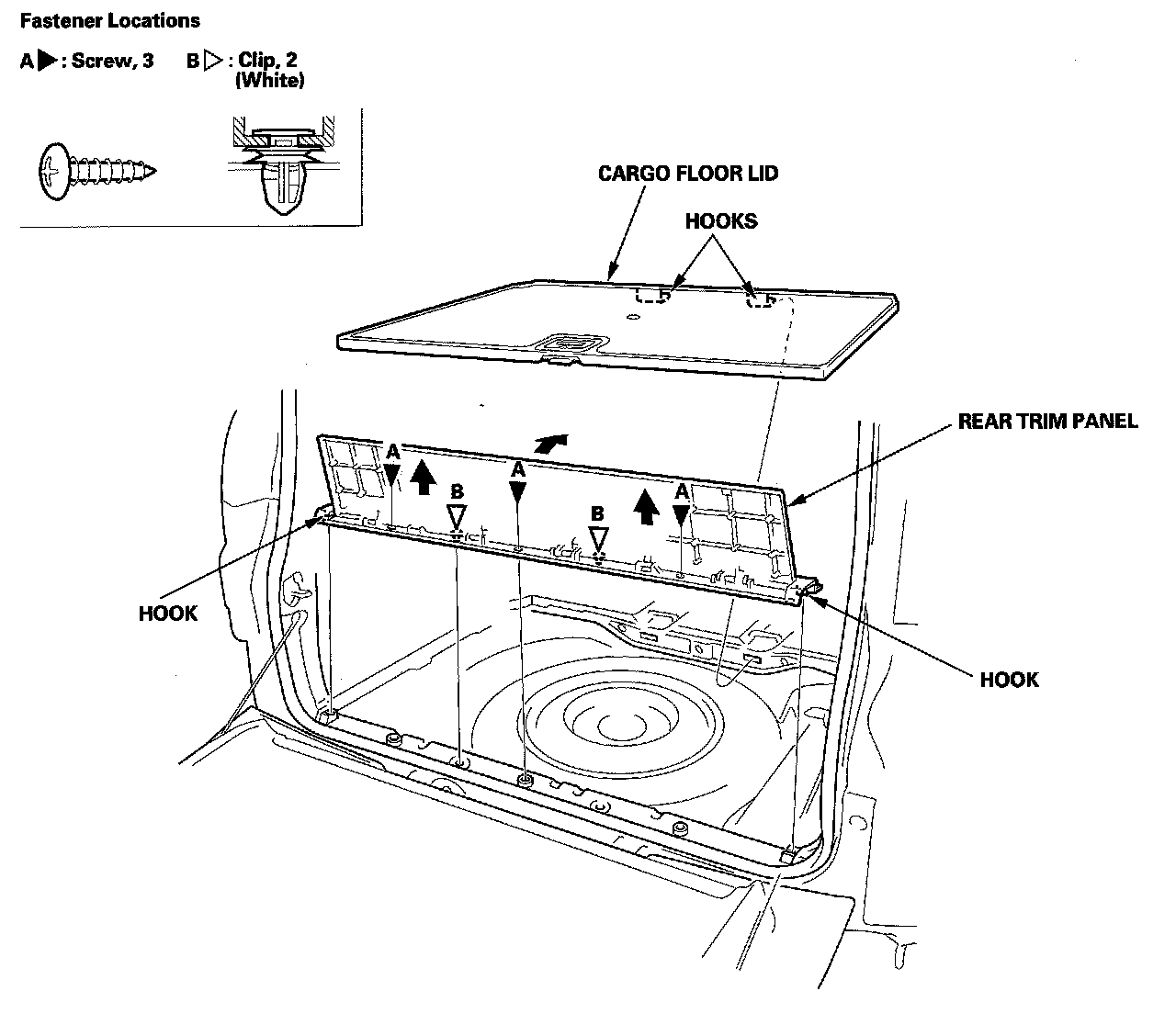 1. Remove the cargo area trim as shown. To remove the rear trim panel, lift up on the hinged section and hold it, then remove the screws and release the clips.