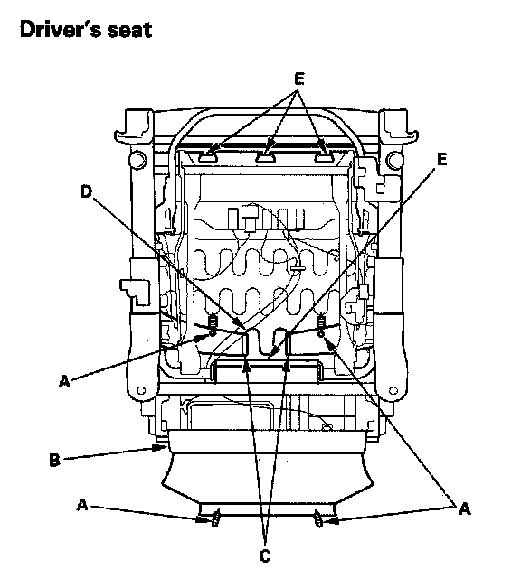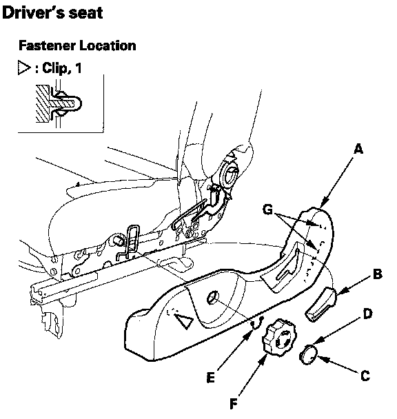 2. Driver's seat: Pull back the cap (C) to release the hooks (D), and remove the snap ring (E), then remove the height handle (F).