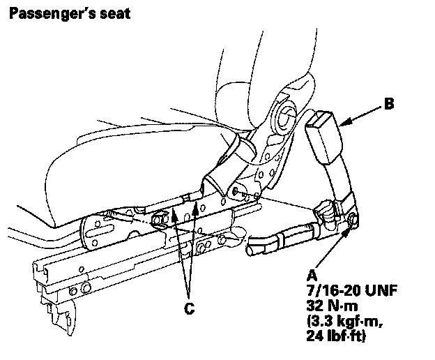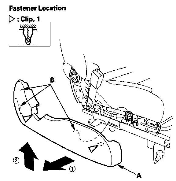 6. Remove the center anchor bolt (A), then remove the seat belt buckle (B).