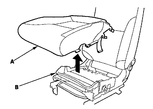9. Release the hook springs (A), pull the seat cushion cover (B).