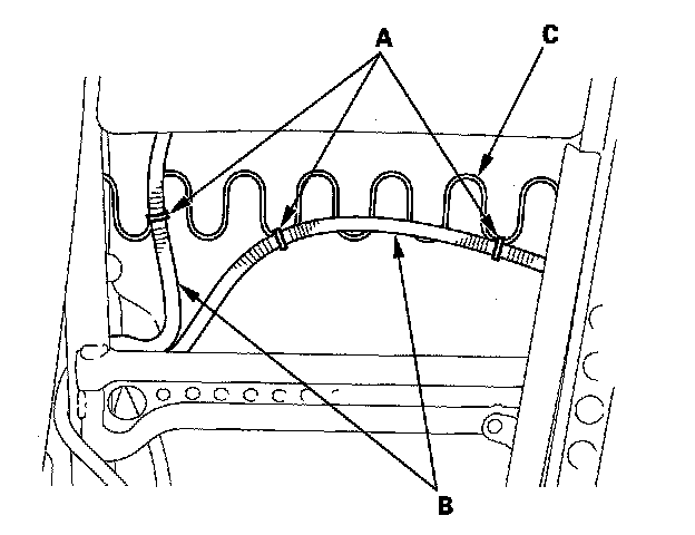 12. Passenger's seat: Release the wire ties (A) fastening the OPDS sensor harnesses (B) to the seat-back frame spring(C).