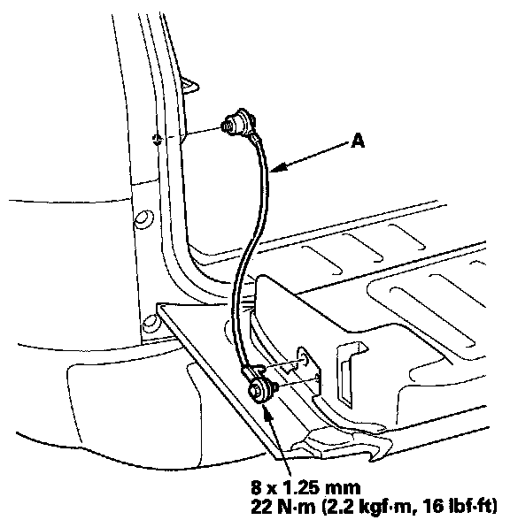 2. Remove the bolts from the body and tailgate, then remove the tailgate support cable (A).