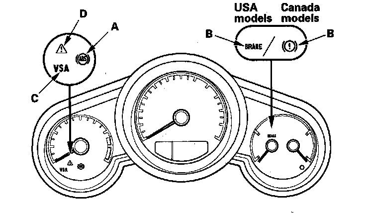 ^ The ABS and VSA indicators come on when the control unit detects a problem in the system. However, even though the system is operating properly, the indicator may come on under these conditions: