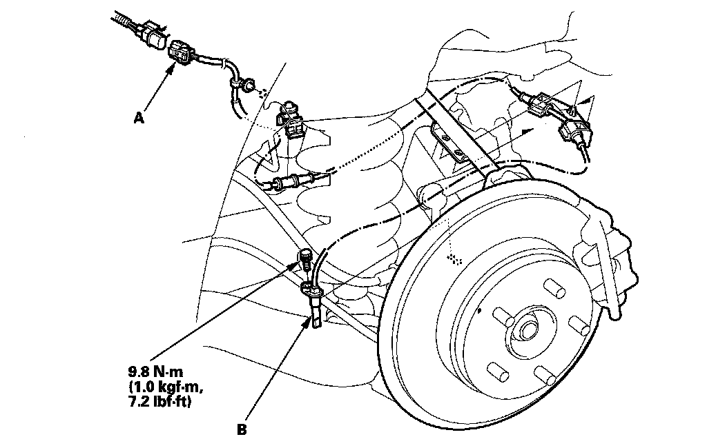 1. Remove the bracket (A), then disconnect the wheel sensor connector (B).