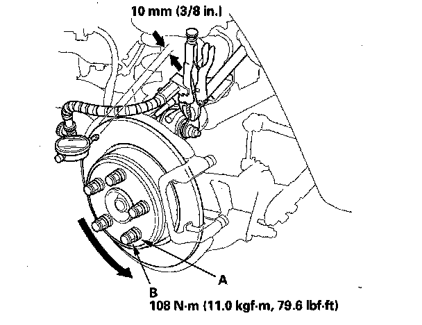 6. Set up the dial gauge against the brake disc/drum as shown, and measure the runout at 10 mm (3/8 in.) from the outer edge of the brake disc/drum.