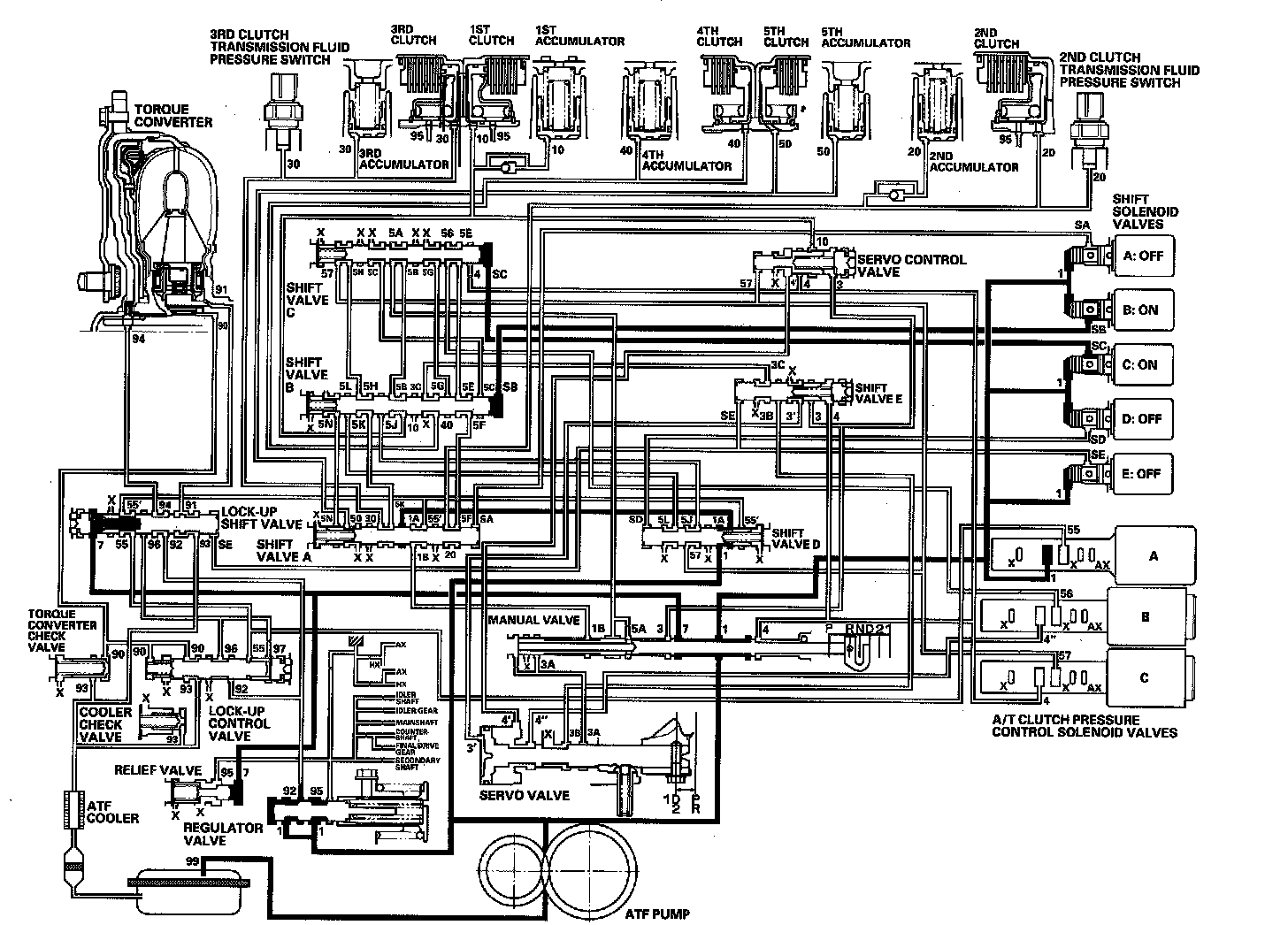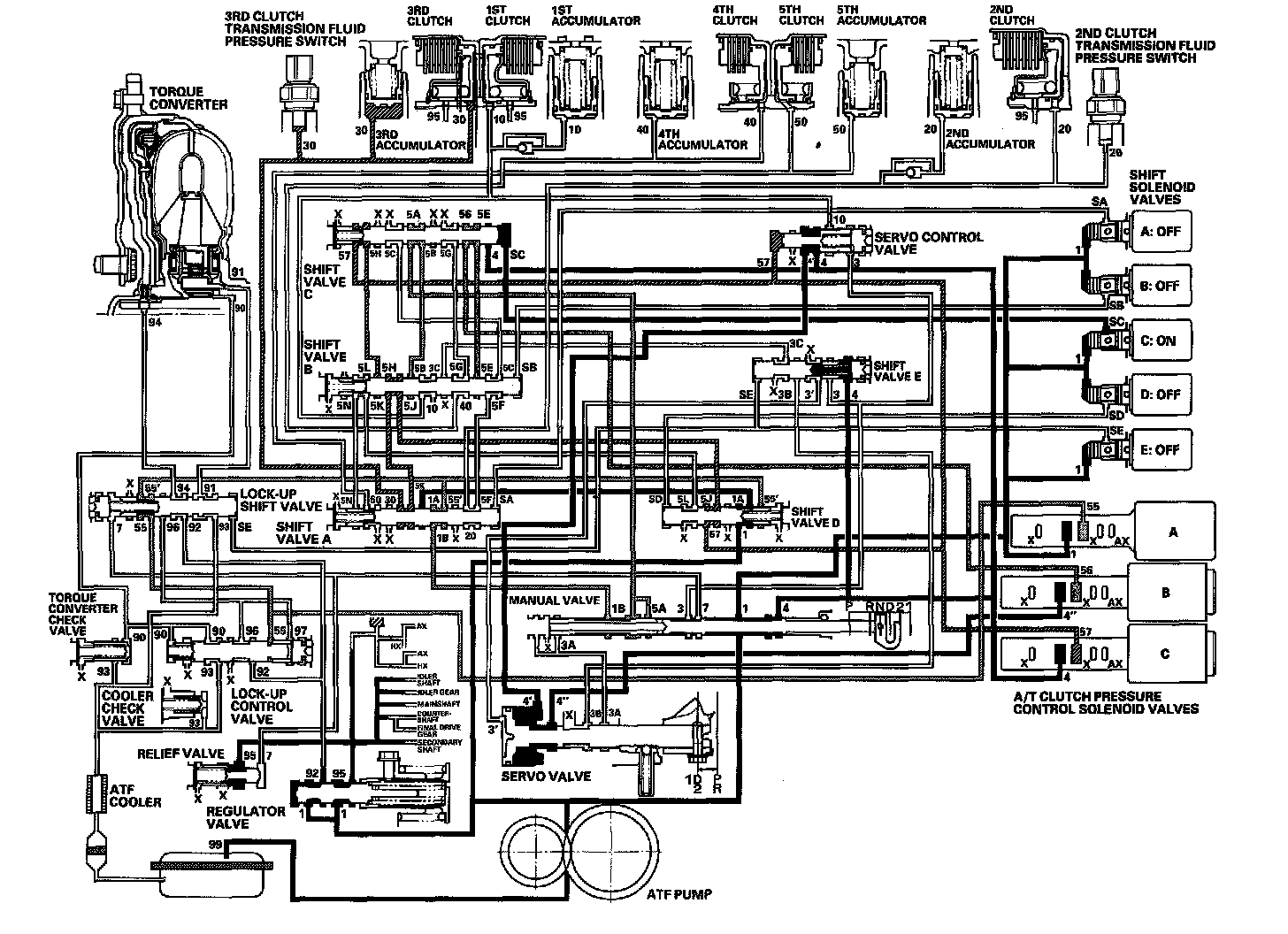 As the speed of the vehicle reaches the prescribed value, the PCM turns shift solenoid valves C OFF, and keeps A, B, D, and E OFF. Shift solenoid valve C pressure (SC) in the right side of shift valve C is released. Shift valve C is moved to the right side to uncover the A/T clutch pressure control solenoid valve B and C pressure ports leading to the 3rd and 4th clutches. The PCM controls the A/T clutch pressure control solenoid valves to regulate hydraulic pressure. A/T clutch pressure control solenoid valve C pressure (57) changes to 3rd clutch pressure (30) at shift valve A, and A/T clutch pressure control solenoid valve B pressure (56) changes to 4th clutch pressure (40) at shift valve B. The 3rd and 4th clutches are engaged gently.