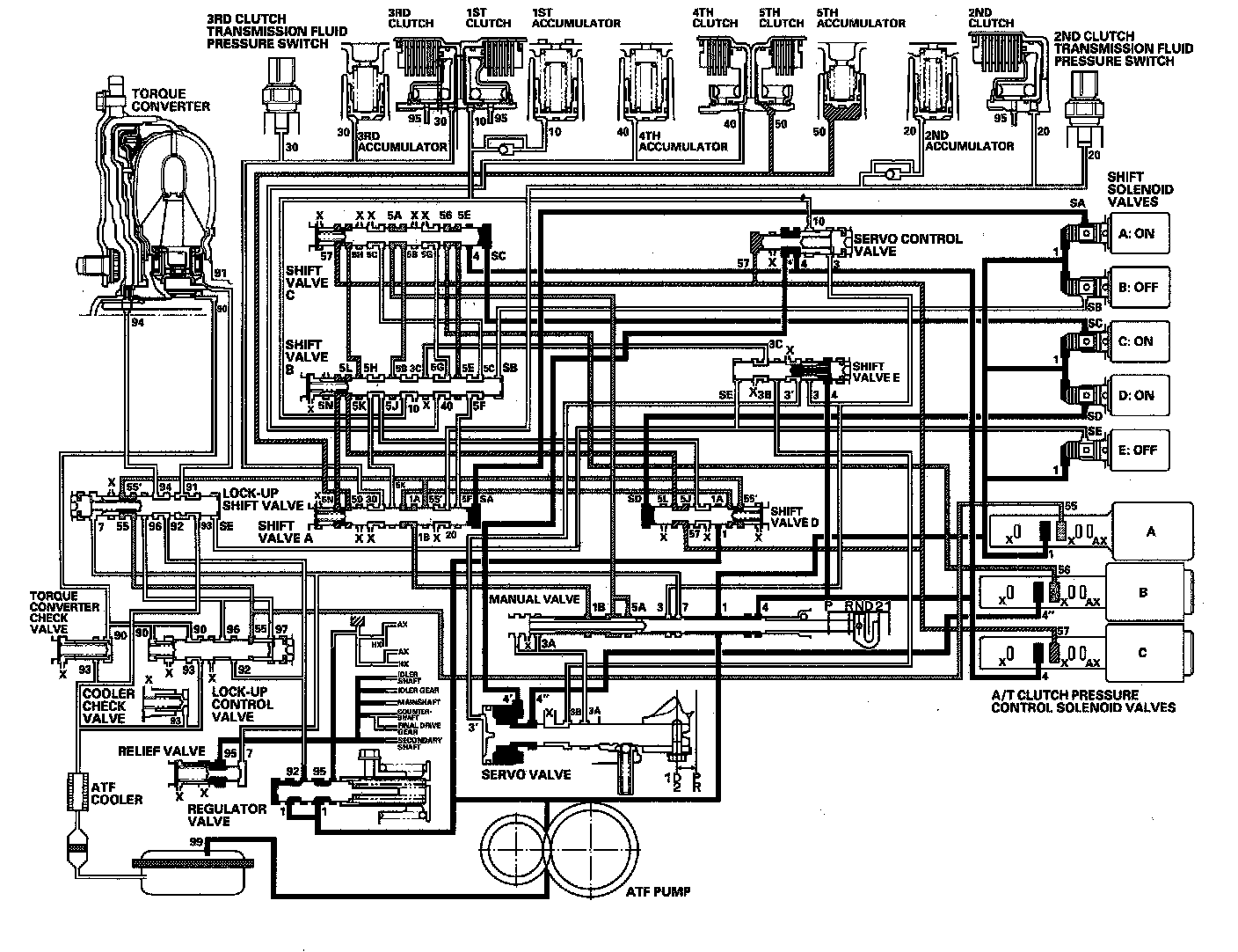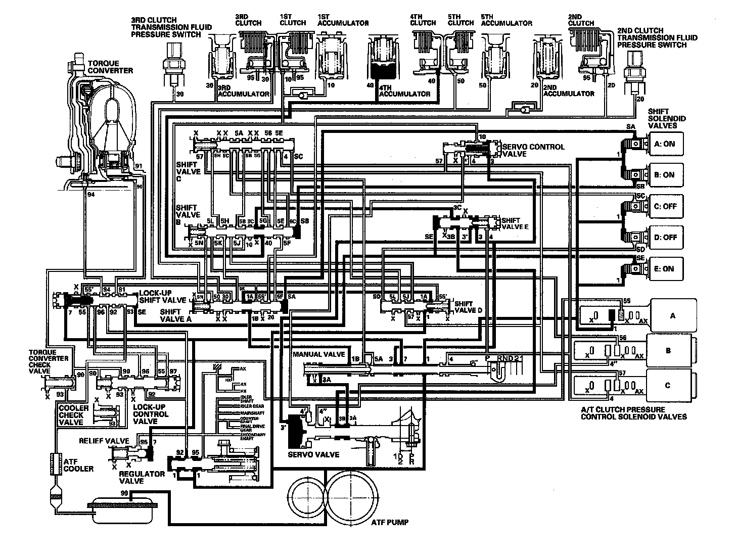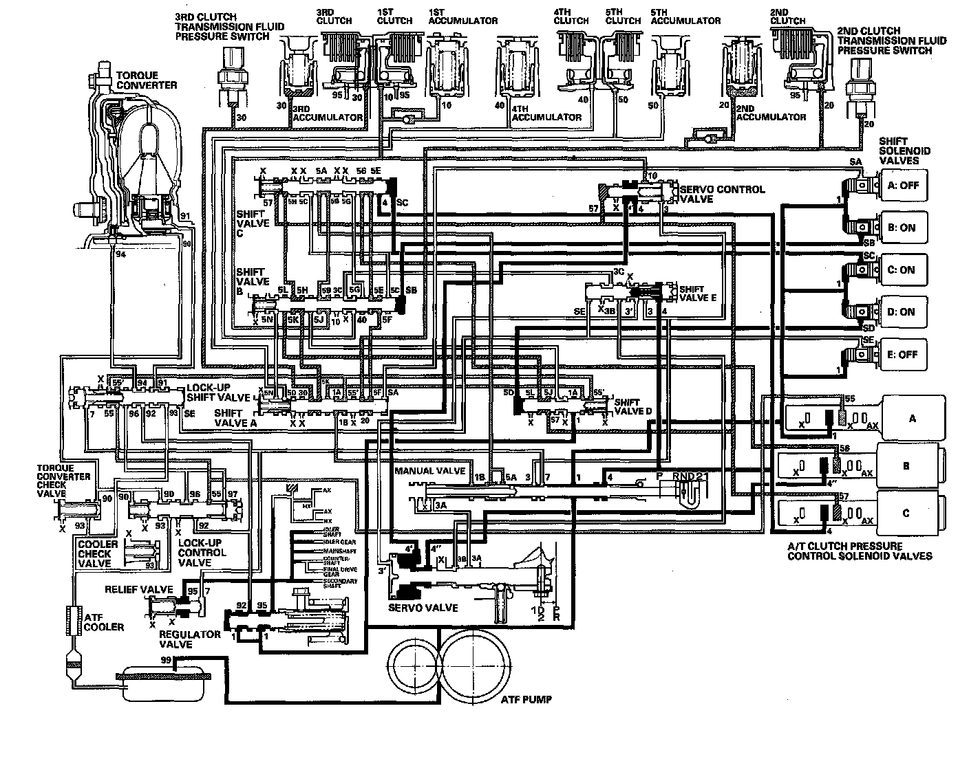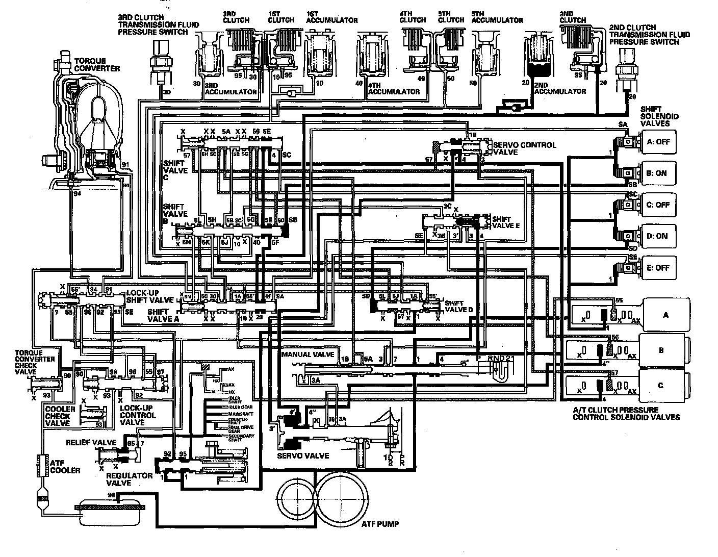 As the speed of the vehicle reaches the prescribed value, the PCM turns shift solenoid valve D ON, and keeps A ON, and B, C, and E OFF. Shift solenoid valve D pressure (SD) is applied to the left side of the shift valve D. Shift valve D is moved to the right side to uncover the A/T clutch pressure control solenoid valve C pressure port leading to the 5th clutch. A/T clutch pressure control solenoid valve B pressure (56) changes to 4th clutch pressure (40) at shift valve B. A/T clutch pressure control solenoid valve C pressure (57) changes to (5L) at shift valve D and to (5N) at shift valve B, and becomes 5th clutch pressure (50) at shift valve A. The 4th and 5th clutches are engaged gently.