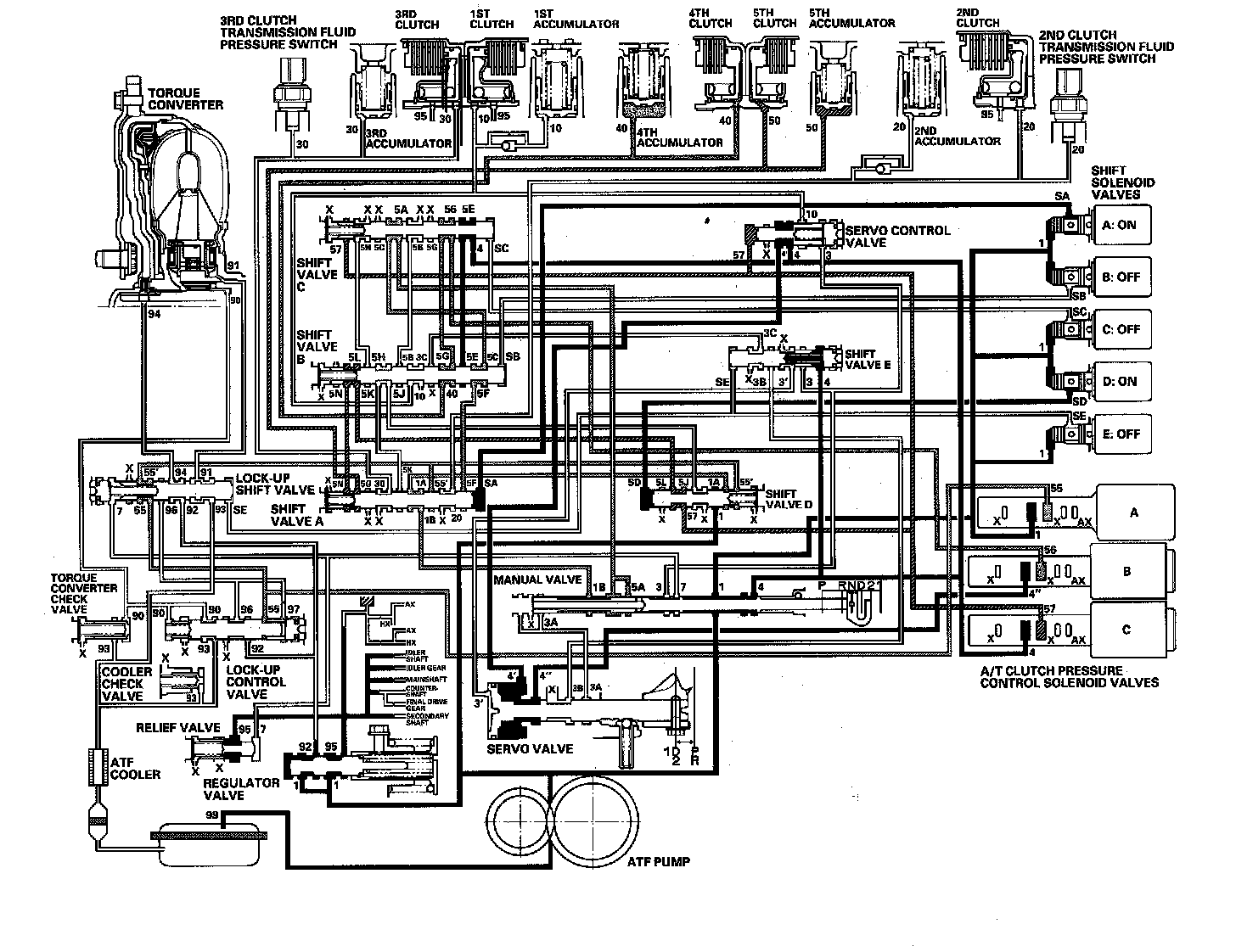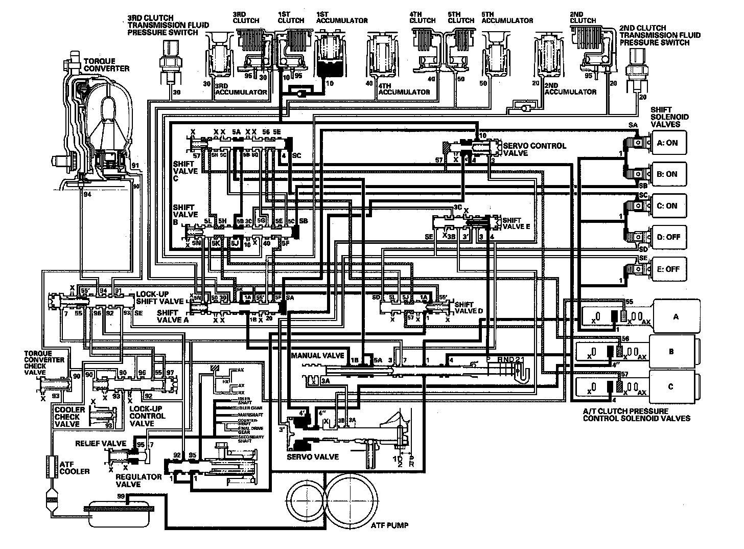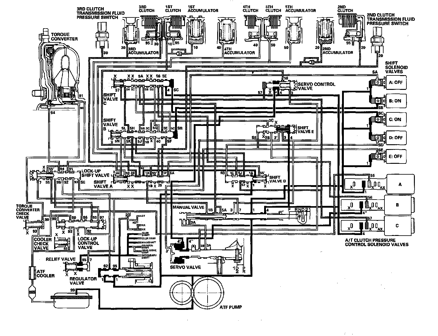 As the speed of the vehicle reaches the prescribed value, the PCM turns shift solenoid valve D ON, and keeps A ON, and B, C, and E OFF. Shift solenoid valve D pressure (SD) is applied to the left side of the shift valve D. Shift valve D is moved to the right side to uncover the A/T clutch pressure control solenoid valve C pressure port leading to the 5th clutch. A/T clutch pressure control solenoid valve B pressure (56) changes to 4th clutch pressure (40) at shift valve B. A/T clutch pressure control solenoid valve C pressure (57) changes to (5L) at shift valve D and to (5N) at shift valve B, and becomes 5th clutch pressure (50) at shift valve A. The 4th and 5th clutches are engaged gently.