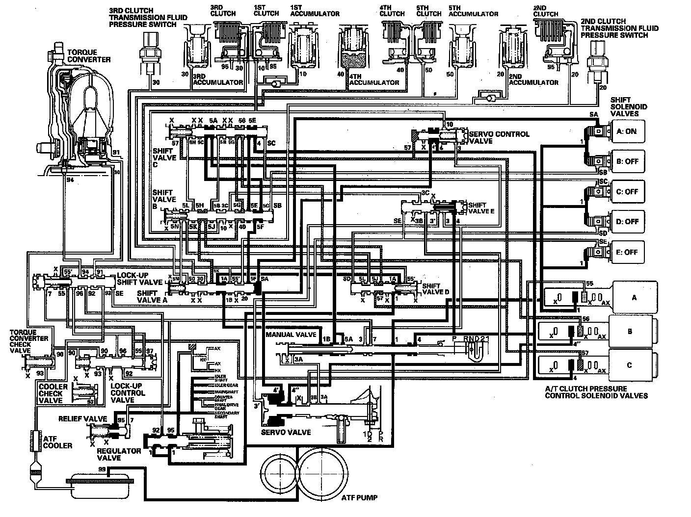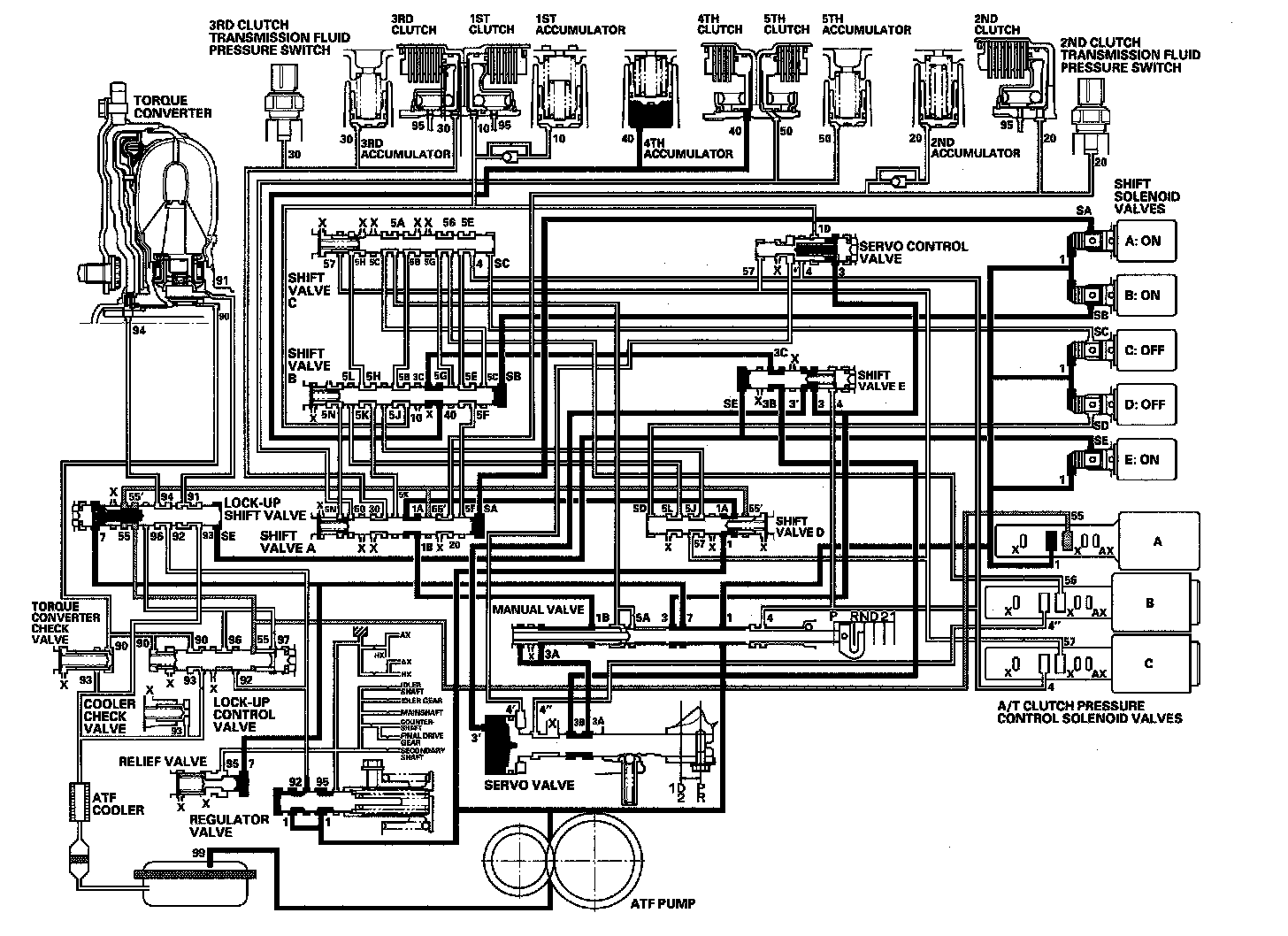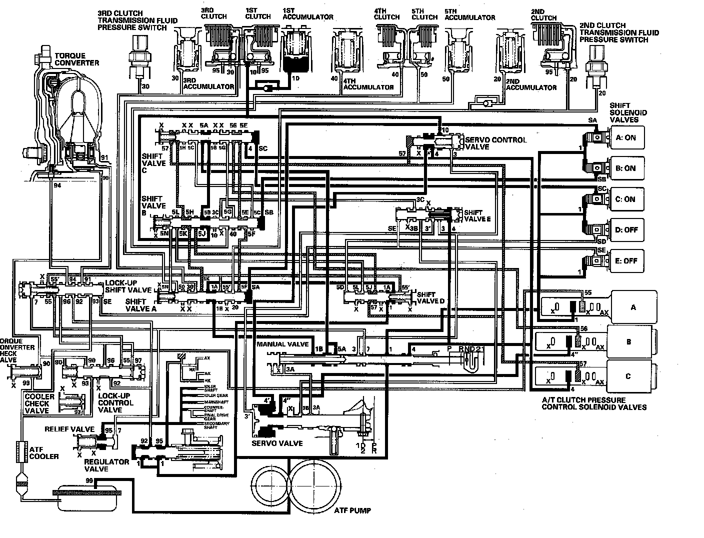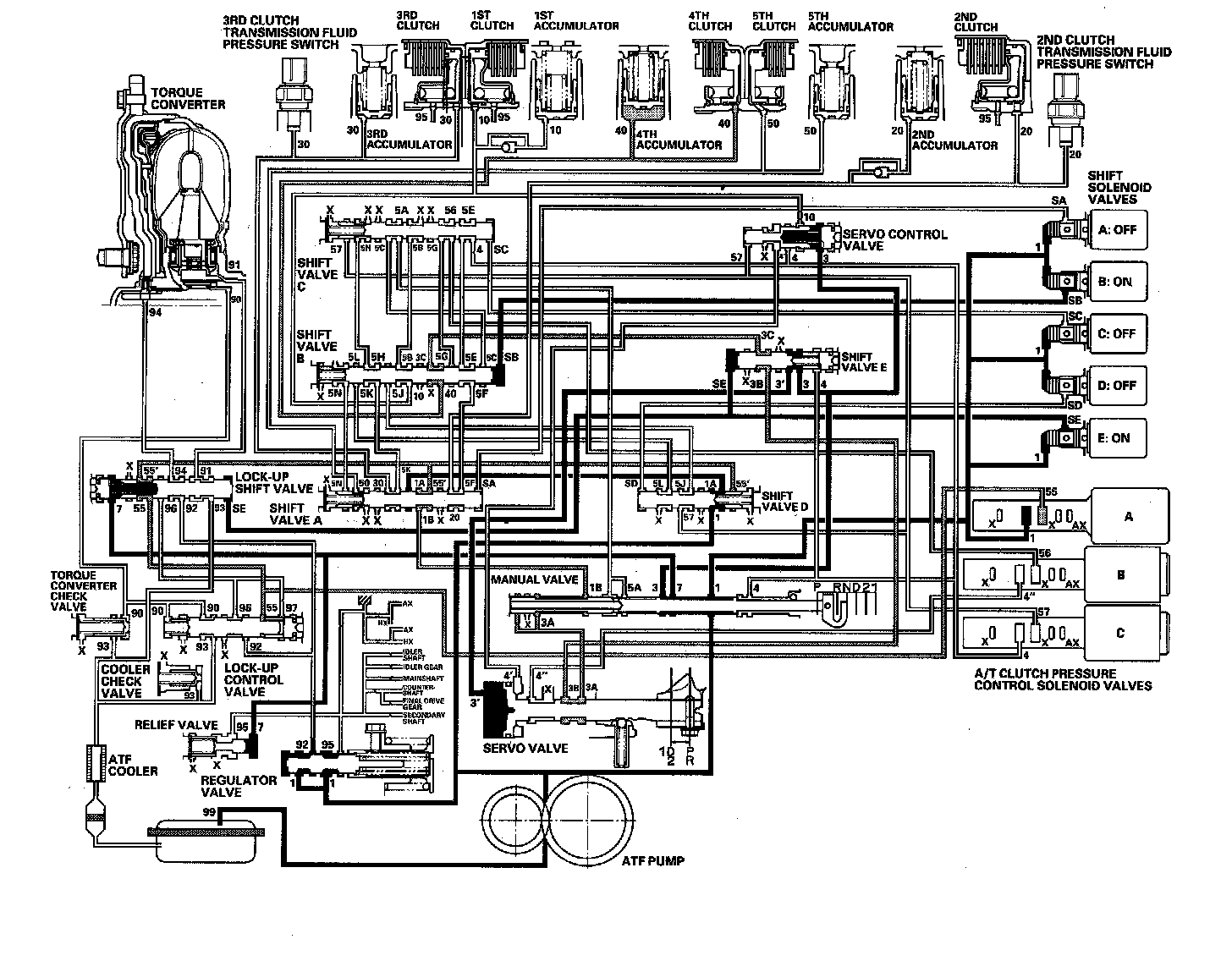 As the speed of the vehicle reaches the prescribed value, the PCM turns shift solenoid valve D ON, and keeps A ON, and B, C, and E OFF. Shift solenoid valve D pressure (SD) is applied to the left side of the shift valve D. Shift valve D is moved to the right side to uncover the A/T clutch pressure control solenoid valve C pressure port leading to the 5th clutch. A/T clutch pressure control solenoid valve B pressure (56) changes to 4th clutch pressure (40) at shift valve B. A/T clutch pressure control solenoid valve C pressure (57) changes to (5L) at shift valve D and to (5N) at shift valve B, and becomes 5th clutch pressure (50) at shift valve A. The 4th and 5th clutches are engaged gently.