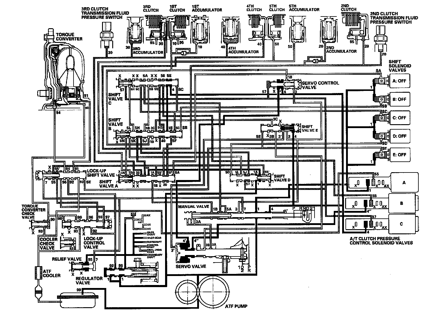 When shifting in the R position, the PCM turns shift solenoid valves B and E ON, and A, C, and D OFF. Shift solenoid valve B pressure (SB) is applied to the right side of shift valve B, and shift valve B is moved to left side. Shift solenoid valve E pressure (SE) is applied to the left side of shift valve E, and shift valve E is moved to the right side. Line pressure (1) changes to (3) at the manual valve, and flows to the servo valve via shift valve E. The servo valve is moved to reverse range position. Movement of shift valves B and E, and servo valve creates 4th clutch pressure line between the 4th clutch and the A/T clutch pressure control solenoid valve A. The 4th clutch pressure (40) is applied to the 4th clutch, and the 4th clutch is engaged gently.