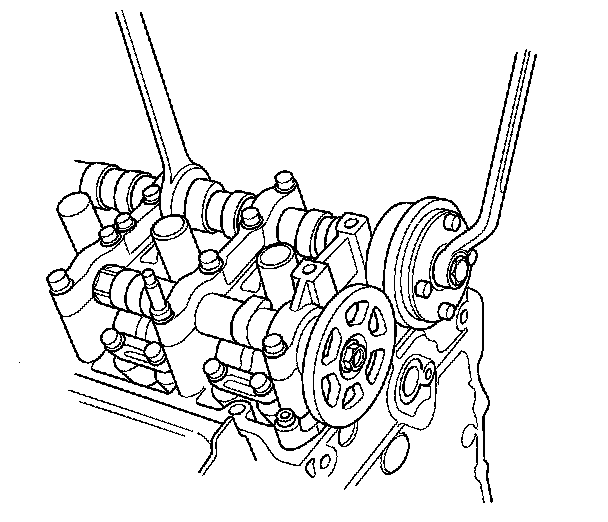 2. Hold the camshaft with an open-end wrench, then loosen the variable valve timing control (VTC) actuator mounting bolt and exhaust camshaft sprocket mounting bolt.