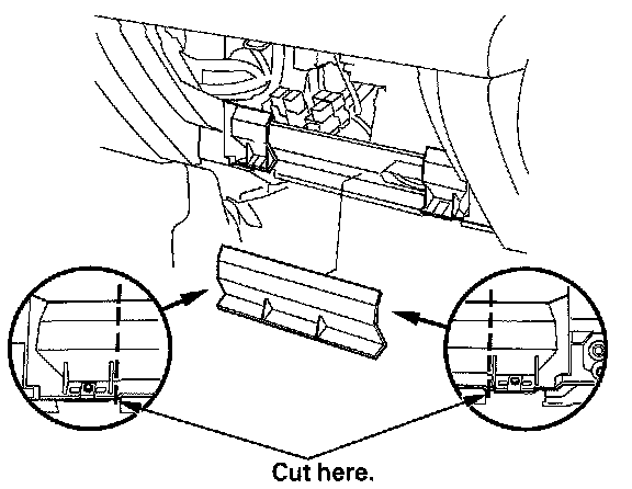 2. Cut the plastic cross brace in the glove box opening with diagonal cutters in the area shown. Remove and discard the plastic cross brace.