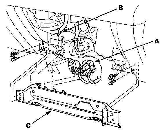 3. Remove the relays (A) and the wire harness clip (B), then remove the bolts and the glove box frame (C).