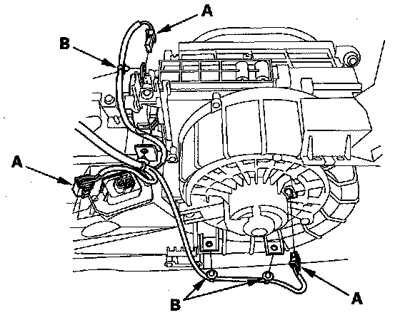 5. Disconnect the connectors (A) from the blower motor, the power transistor, and the recirculation control motor, then remove the wire harness clips (B).