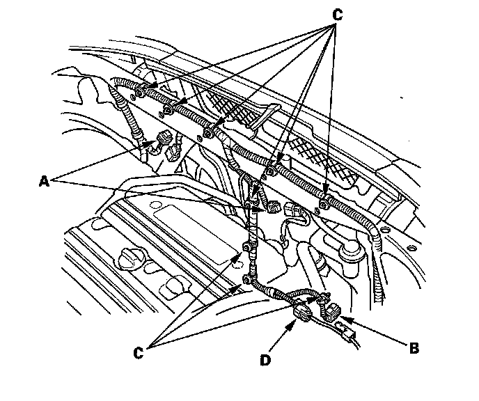 3. Disconnect the fan motor connectors (A) and engine coolant temperature (ECT) sensor 2 connector (B), then remove the harness clamps (C) and A/C compressor clutch connector (D).