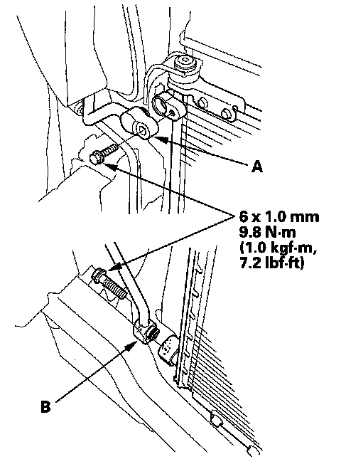 4. Remove the bolts and mounting brackets (A), then remove the A/C condenser (B) by lifting it up. Be careful not to damage the radiator and A/C condenser fins when removing the A/C condenser.