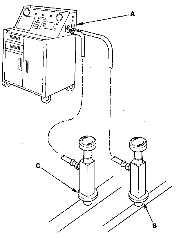 1. Connect an R-134a refrigerant recovery/recycling/charging station (A) to the high-pressure service port (B) and the low-pressure service port (C), as shown, following the equipment manufacturer's instructions.