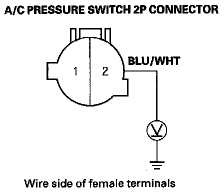 A/C Pressure Switch Circuit TroubleshootingNOTE: Do not use this troubleshooting procedure if any of these items are working properly with the A/C switch ON; A/C condenser fan, radiator fan and A/C compressor, or the heater does not work. Refer to the symptom troubleshooting index. Symptom Related Diagnostic Procedures