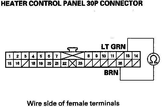 13. Measure the resistance between the No. 13 and the No. 28 terminals of the heater control panel 30P connector.