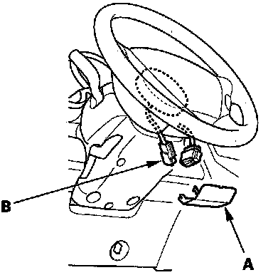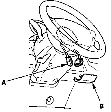 2. Remove the access panel (A) from the steering wheel, then disconnect the driver's airbag 4P connector (B) from the cable reel.