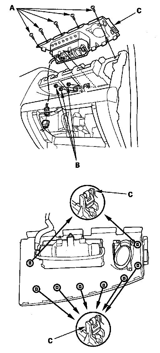 5. Remove the screws (A) and the mounting nuts (B) from the bracket. Cover the lid and dashboard with a cloth, and pry carefully with a screwdriver to lift the front passenger's airbag (C) out of the dashboard.