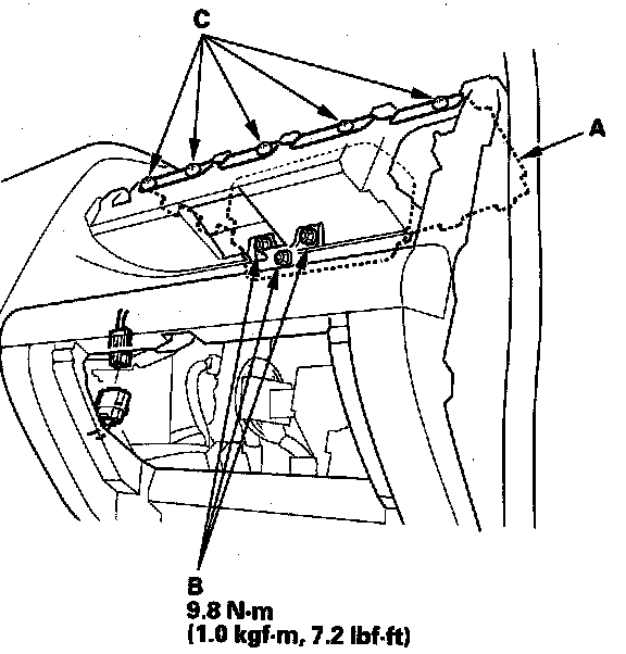 1. Place the new front passenger's airbag (A) into the dashboard. Tighten the mounting nuts (B) and screws (C).