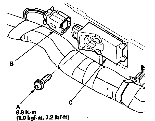 1. Install the new roll rate sensor with a TORX bolt (A), then connect the floor wire harness 2P connector (B) to the roll rate sensor (C).