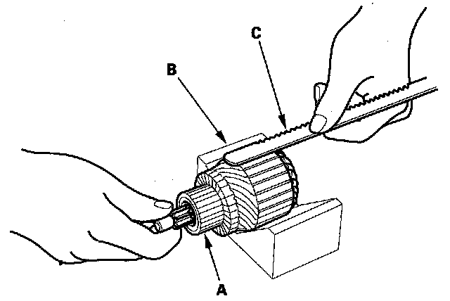 9. Place the armature (A) on an armature tester (B). Hold a hacksaw blade (C) on the armature core. If the blade is attracted to the core or vibrates while the core is turned, the armature is shorted. Replace the armature.