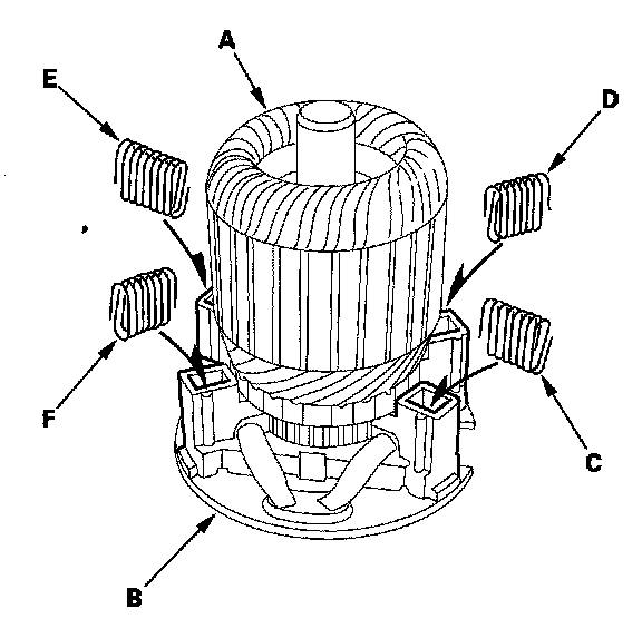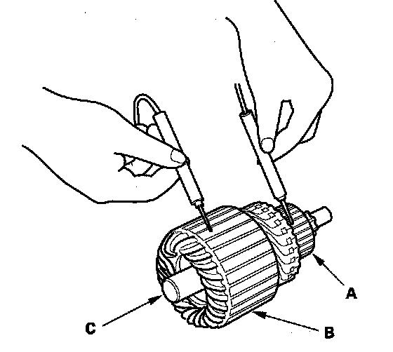 10. Use an ohmmeter to check for continuity between the commutator (A) and the armature coil core (B), and between the commutator and the armature shaft (C). If there is continuity, replace the armature.