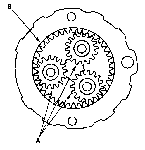 13. Check the planetary gears (A) and ring gear (B) for wear or damage. Replace them if they are worn or damaged.