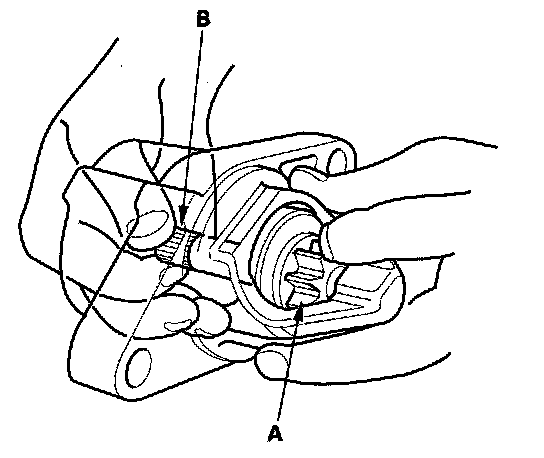 14. While holding the drive gear (A), turn the gear shaft (B) clockwise. Check that the drive gear comes out to the other end. If the drive gear does not move smoothly, replace the gear cover assembly.