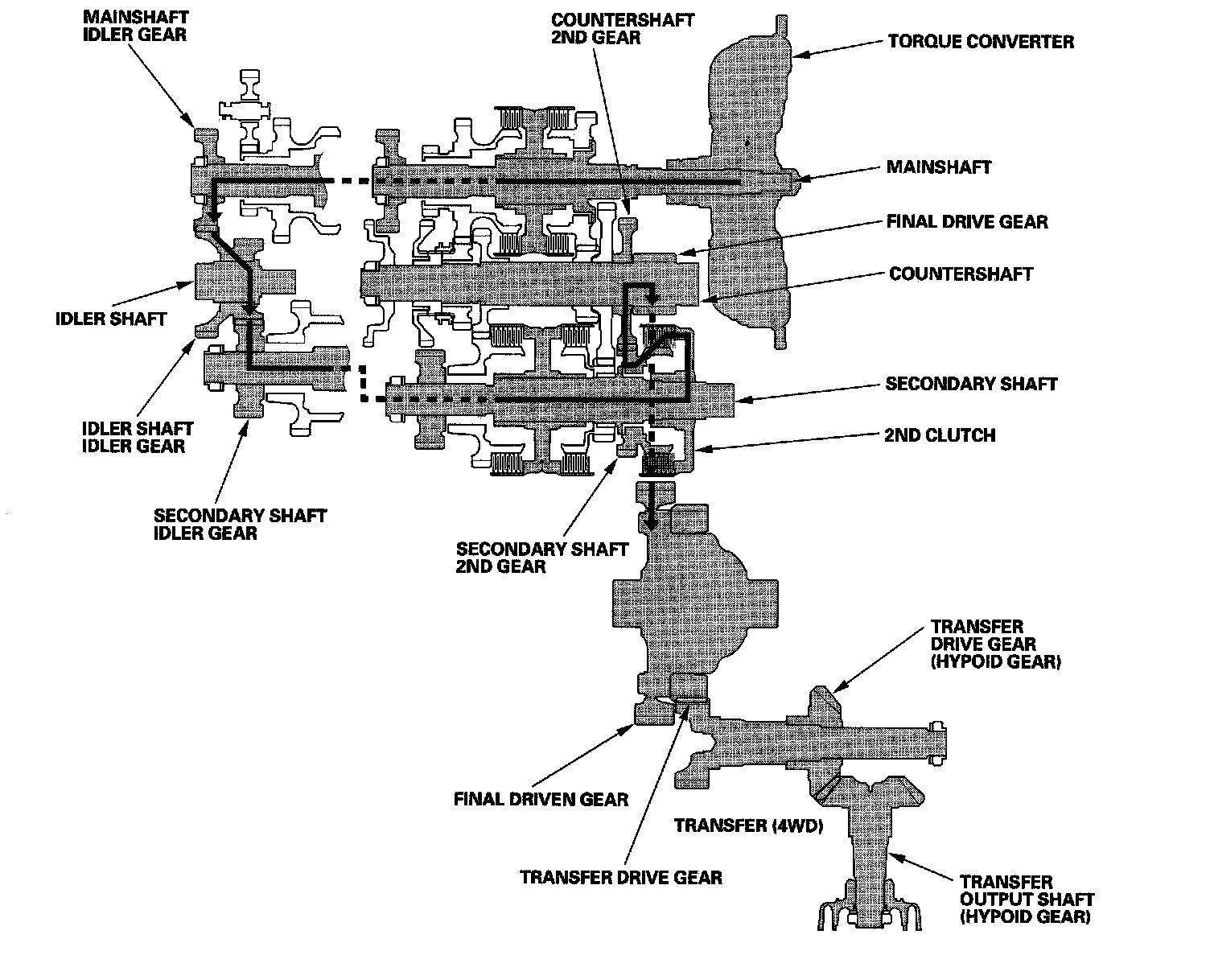 The torque converter consists of a pump, turbine, and stator assembly in a single unit. The converter housing (pump) is connected to the engine crankshaft and turns as the engine turns. Around the outside of the torque converter is a ring gear which meshes with the starter pinion when the engine is being started. The entire torque converter assembly serves as a flywheel while transmitting power to the transmission mainshaft, the transmission has three parallel shafts; the mainshaft, the countershaft, and the secondary shaft. The mainshaft is in line with the engine crankshaft, and includes the 4th and 5th clutches, and gears for 5th, 4th, reverse, and idler. The mainshaft reverse gear is integral with the mainshaft 4th gear. The countershaft includes the gears for 1st, 2nd, 3rd, 4th, 5th, reverse, park, and the final drive. The final drive gear is integral with the countershaft. The countershaft 4th gear and the countershaft reverse gear can be locked to the countershaft providing 4th or reverse gear, depending on which way the selector is moved. The secondary shaft includes the 1st, 2nd, and 3rd clutches, and gears for 1st, 2nd, 3rd, and idler. The idler shaft is located between the mainshaft and secondary shaft, and the idler gear transmits power between the mainshaft and the secondary shaft. The gears on the mainshaft and the secondary shaft are in constant mesh with those on the countershaft. When certain combinations of gears in the transmission are engaged by the clutches, power is transmitted through the mainshaft, then to the secondary shaft to the countershaft or through the mainshaft to the countershaft to provide drive.