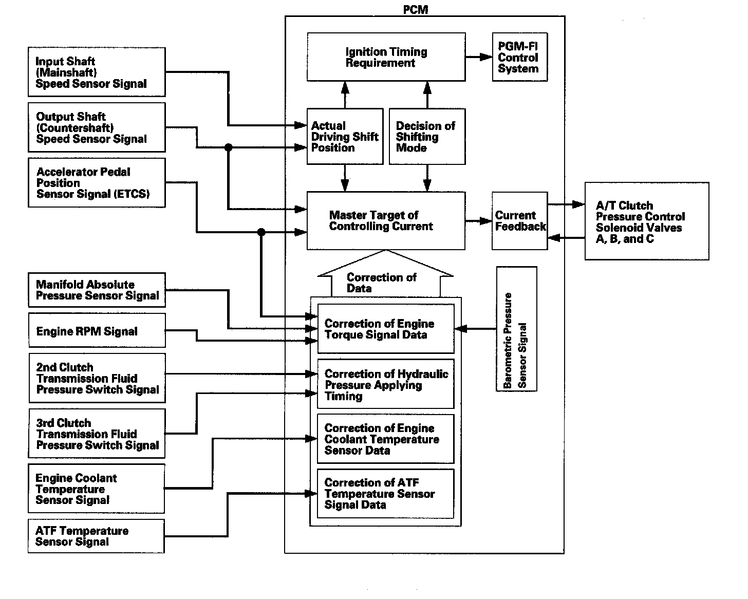 The PCM controls to shift gears shift solenoid valves A, B, C, D, and E, and the A/T clutch pressure control solenoid valves A, B, and C, while receiving input signals from various sensors and switches located throughout the vehicle. The shift solenoid valves shift the positions of the shift valves to switch the port leading hydraulic pressure to the clutch. The A/T clutch pressure control solenoid valves A, B, and C regulate their respective pressure, and pressurize to the clutches to engage it and its corresponding gear. The pressures of the A/T clutch pressure control solenoid valves also apply to the shift valves to switch the port.
