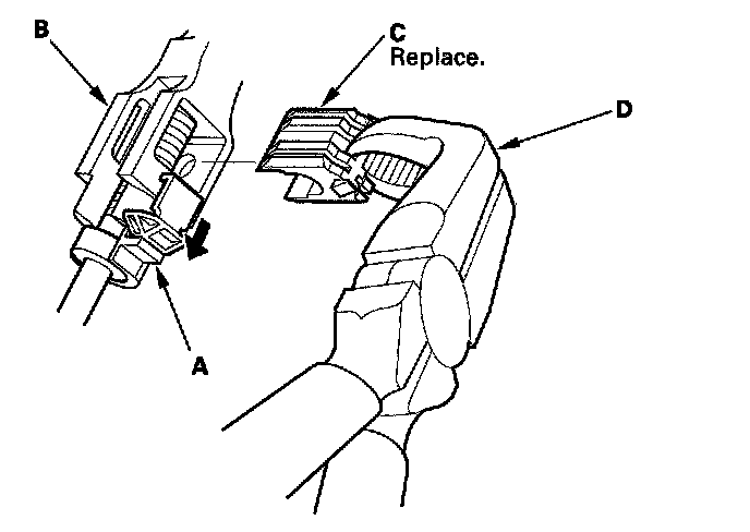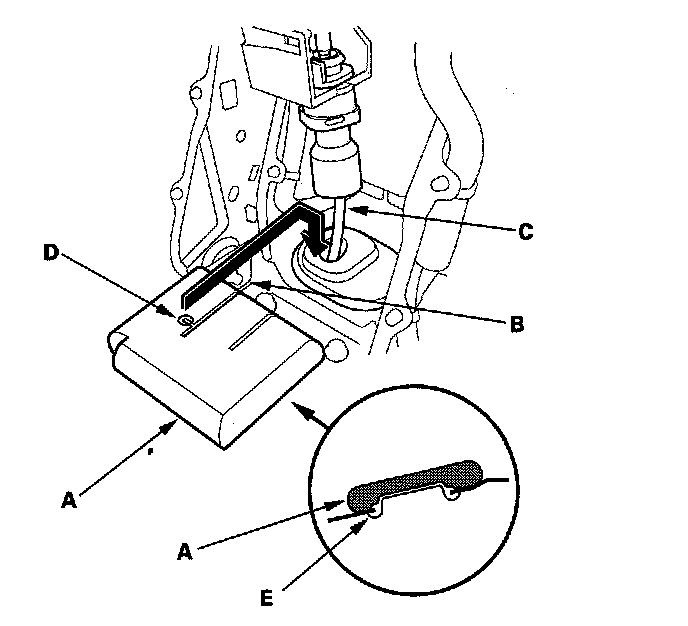 16. Install the shift cable insulator (A) along the slot (B) over the shift cable (C), and position the shift cable in the left end (D) of the slot.