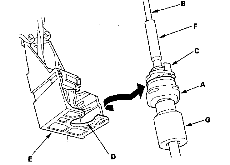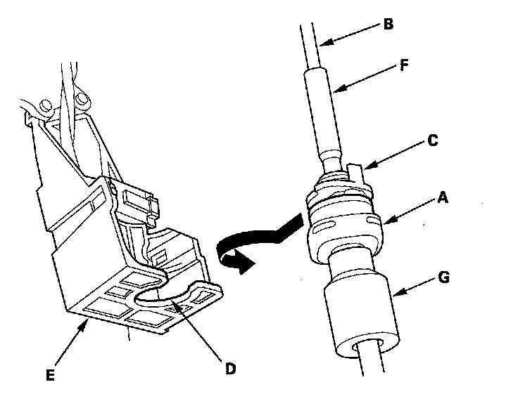 7. Rotate the socket holder (A) on the shift cable (B) a quarter turn; the tab (C) on the socket holder will be in the opening (D) of the shift cable bracket (E). Then slide the holder to remove the shift cable from the shift cable bracket. Do not remove the shift cable by twisting shift cable guide (F) and damper (G).