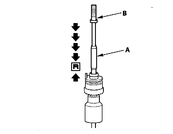 8. Push the shift cable down until it stops, then release it. Pull the shift cable back one step so that the shift cable is in R. Do not hold the shift cable guide (A) to adjust the shift cable (B).