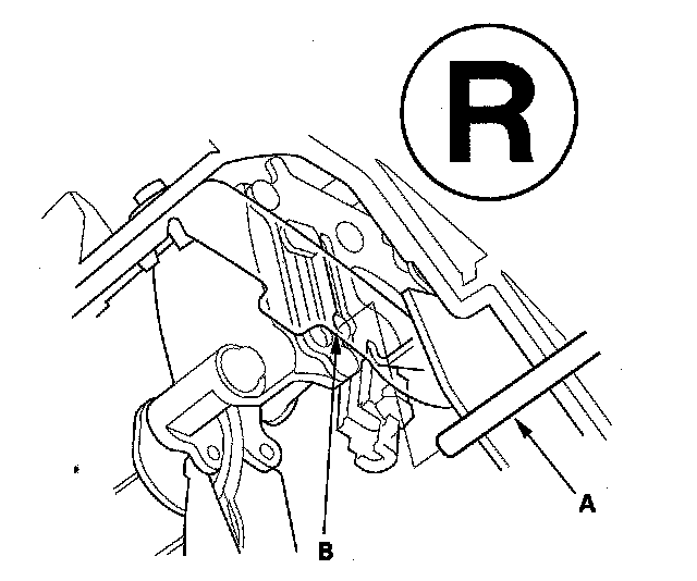11. Insert a 6.0 mm (0.24 in.) pin (A) into the positioning hole (B) on the shift lever bracket through the positioning hole on the shift lever. The shift lever is secured in the R position.