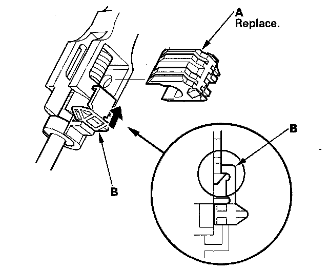 14. Install the new shift cable lock (A) to secure the shift cable end and shift cable end holder, then push the lock tab (B) up until it stops to lock joint.