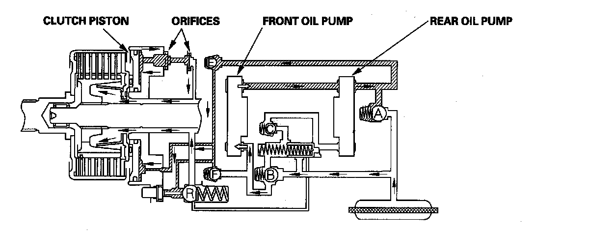 Some of the fluid that is discharged by the front oil pump is drawn in by the rear oil pump. The remaining fluid passes through check valve F into the cylinder of the clutch piston, where it is regulated by two orifices.