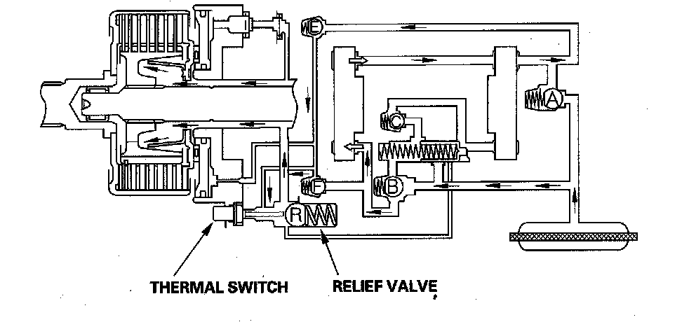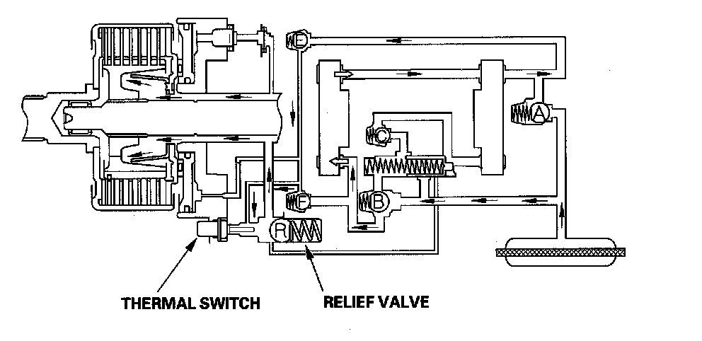 If the temperature of the fluid in the differential goes too high, the thermal switch pushes open the relief valve R. This causes the pressure in the clutch piston to drop, and 4WD mode is disengaged.