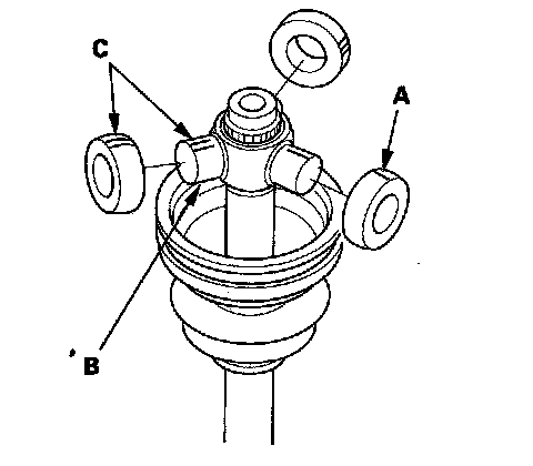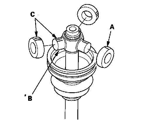 8. Fit the boot (A) ends onto driveshaft (B) and the inboard joint (C).