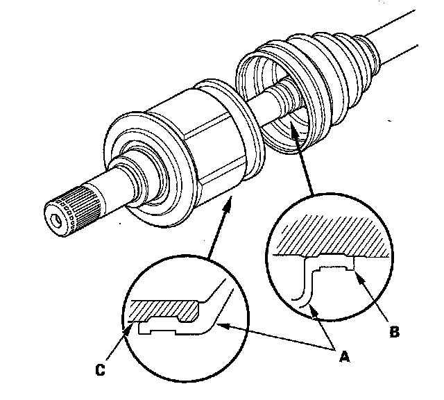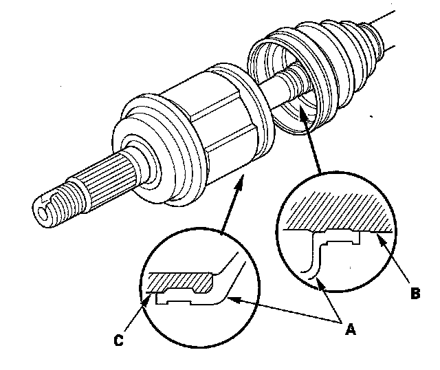 8. Fit the boot (A) ends onto driveshaft (B) and the outboard joint (C).