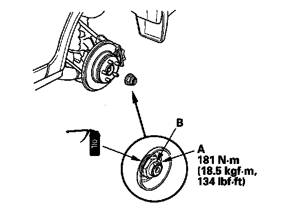 5. Install a new spindle nut, then tighten the nut. After tightening, use a drift to stake the spindle nut shoulder (B) against the driveshaft.